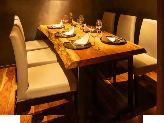 都会の中心エリアにあるとは思えない、静かで落ち着いた店内。オシャレ感漂う和モダンな空間には、趣の異なるテーブル席が配されており、すべて個室仕様になっています。個室は、2名~6名に対応。6席あるカウンターも、4名以上で個室としての利用が可能です。厳選された美酒とともに、感性に響く特別な時間をお過ごしください。