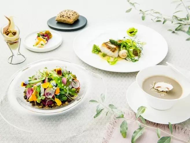 国産食材を多用したランチ、ディナーコースはそれぞれ管理栄養士とシェフの力作。美肌づくりや、骨の健康、筋肉づくりに脂肪燃焼といったことまで考えられたメニューで、からだが喜ぶ食体験ができそうです。