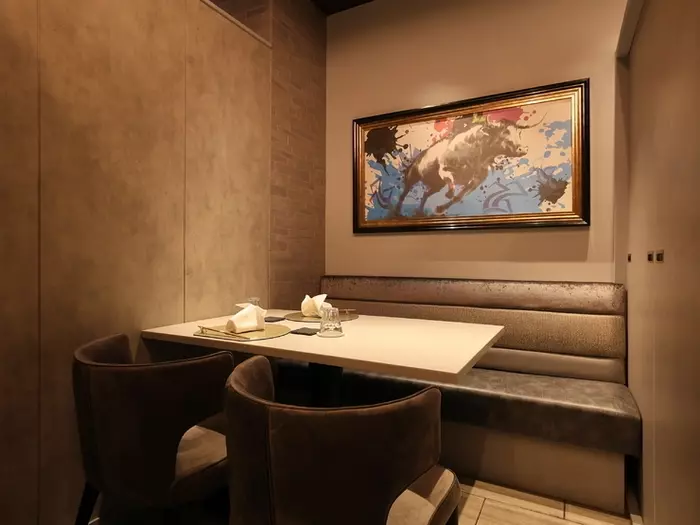 店内は、ミシュラン店も手がけたデザイナーが監修する和モダン空間。躍動感あふれる牛が描かれたアートが目を引きます。カウンター席やテーブル席のほか、最大8名まで利用できる完全個室を用意。記念日デートや接待、会食など、さまざまなシーンにふさわしい上質な空間になっています。