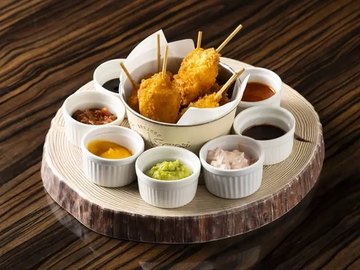 味変が楽しめる『名物串カツバラエティセット7種ディップソース盛り合わせ』