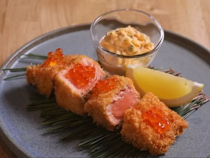 『鮭のレアカツ自家製タルタルソース』は鮭の旨みが楽しめる一品
