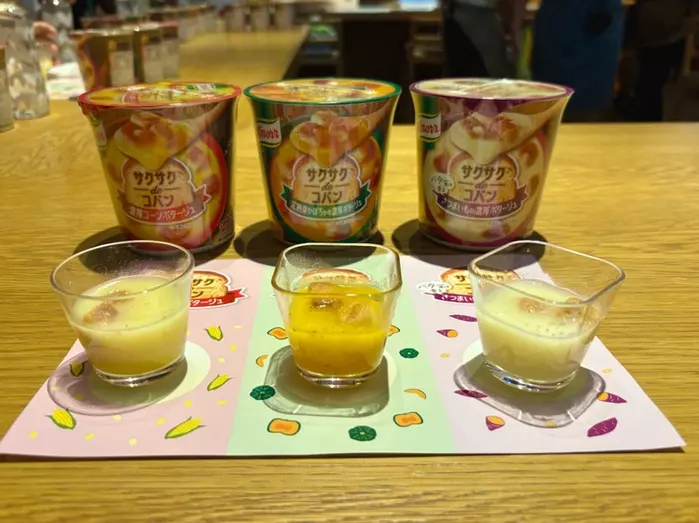 「クノール® サクサクde コパン」左から<北海道産スーパースイートコーンの濃厚コーンポタージュ><完熟栗かぼちゃの濃厚ポタージュ><バター風味香る さつまいもの濃厚ポタージュ>