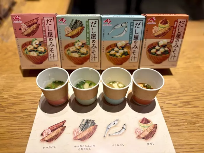 「選択の邸」で体験したのは、新ブランド「だし屋のみそ汁」の飲み比べ。こちらの商品は、長年「ほんだし®」で培った技術を活かし、だし素材のうま味を最大限に引き出した即席みそ汁で、香り・コク・味わいが際立つ<かつおだし>をはじめ、<かつおとこんぶのあわせだし><いりこだし>、<赤だし>など全4種類を展開。お湯を注ぐだけで、一口目から最後まで「だし」の効いた深い味わいが楽しめます。お客様向けお問い合わせ先