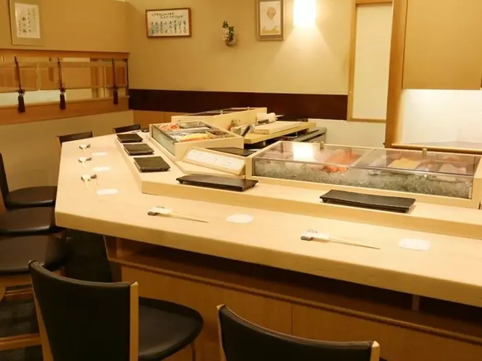 ランチタイムには同じ内容の寿司を、手頃な価格で楽しめるのも魅力的です。店内はカウンター席だけでなく、ゆったりとくつろげるテーブル席も完備。会食や接待のみならず、家族や恋人と立ち寄りやすい寿司店です。