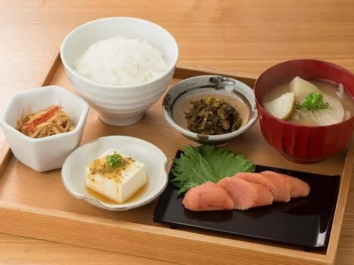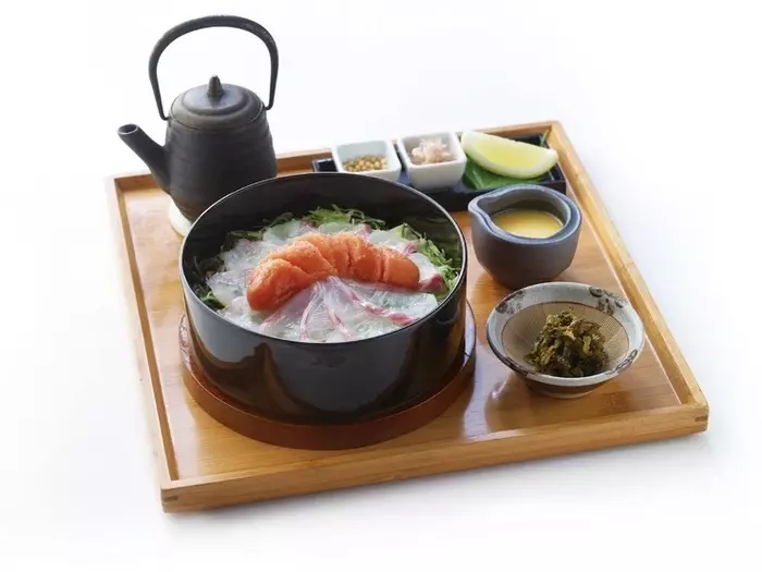 一番人気メニューは、博多名物のめんたいこと鯛茶漬けを合わせた椒房庵流ひつまぶし『博多めん鯛まぶし』。レモンを搾って、卵黄だしとろろをまぶして、そして最後はだし茶漬けで。羽釜ご飯とともに一度に三度楽しめます。あごだしめんたいこをシンプルに味わうなら、『椒房庵のあごだしめんたいこ御膳』もオススメ。