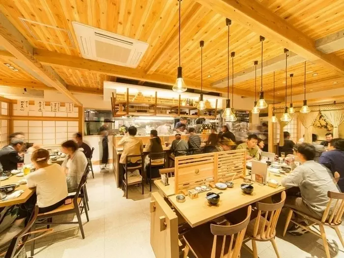 JR博多駅構内、JR博多シティ「シティダイニングくうてん」にある【めんたい料理 博多 椒房庵】は、あごだしめんたいこでお馴染み、「椒房庵」のめんたい料理が味わえる唯一の料理店です。ゆとりのあるテーブル席は、食事やお酒をゆっくりと楽しむことが出来る、心地よいつくり。半個室もあるので、家族連れにもぴったりです。