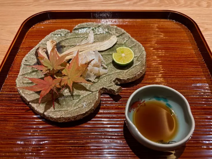 「毛蟹、松茸のしゃぶしゃぶ」炭火焼の後はしゃぶしゃぶで。鰹だしにつけていただきます。だし自体に蟹や松茸の旨みが溶け出し、そのだしにつけていただく松茸は滋味深く、蟹はさらに甘みが増していました