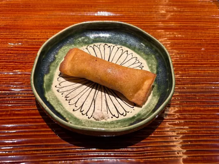 「蟹、鱶鰭の春巻き」少し厚みのある生地の中に、鱶鰭と蟹の餡が入った春巻き。噛むと旨みが広がる逸品です