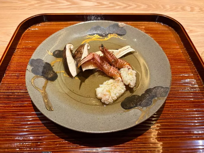 「毛蟹、松茸の炭火焼き」蟹は熱が加えられると甘みが増すそうで、まずは刺身で生の毛蟹を味わい、そのあとに焼いた毛蟹をいただくことで、調理法で蟹の味わい、食感、風味が異なることを実感できます。松茸も肉厚で旨みたっぷり。とても贅沢です