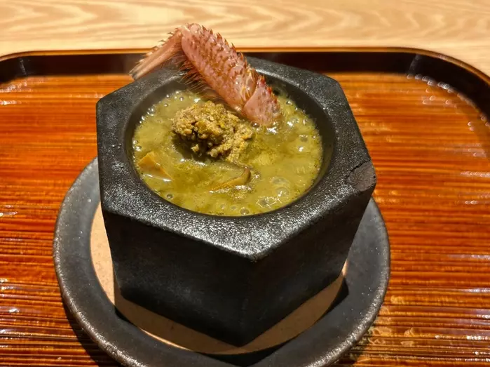 「毛蟹、鮑」さっぱりとした鮎素麺のあとは、鮑の肝と蟹味噌、雲丹を使った濃厚なソースに、焼いた毛蟹につけていただく濃厚な逸品が供されました。