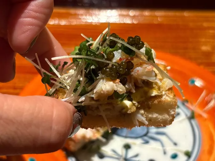 「毛蟹、キャビア」焼いたパンの上にマスカルポーネを塗り、蟹味噌、ほぐした蟹の身、キャビアとともにいただきます。先ほどの春巻きもそうですが、素材そのもののおいしさをいただく調理法の合間に、揚げ物や濃い目の味付けで変化をつけられているので、コースの流れにメリハリが出てとても心地よくいただけました