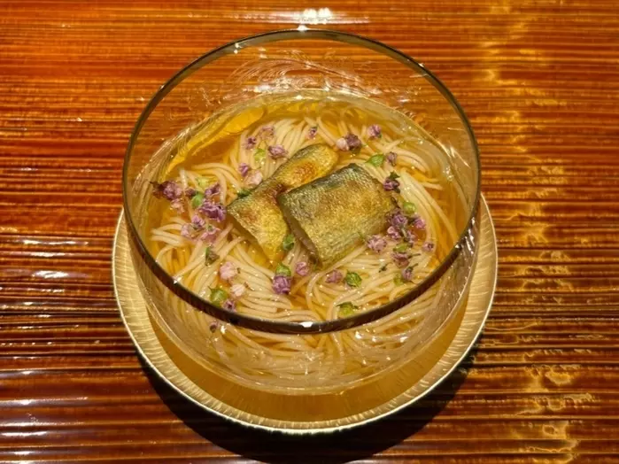 「鮎素麺」まるで絵画のような美しさの冷鉢。すっきりとした味わいのおだしと鮎が清涼感を与えてくれます