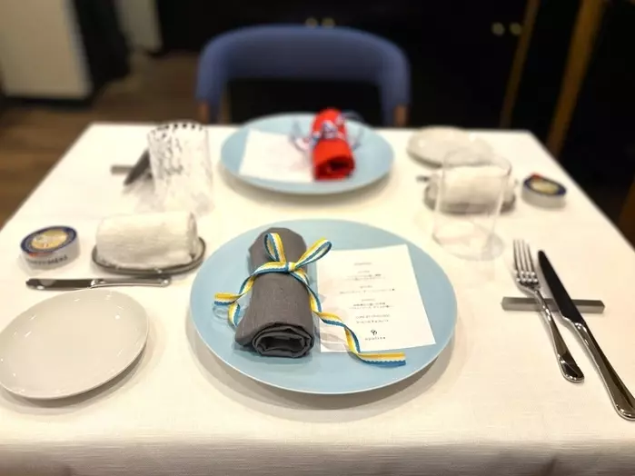 店名“opaline”になぞらえた宝石オパールカラーのウェルカムプレートと、フランスのトリコロールカラーがアクセントになった店内