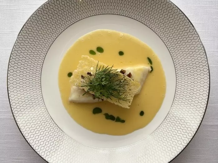『浜田港から届いた平目 ノワイリーソース ディルの香り(poisson 魚料理)』。島根県・浜田港から直送された新鮮な平目を使用した一皿。上品な甘みをもつ平目に、フランス料理伝統のノワイリーソースを合わせ、爽やかなディルの香りを添えて仕上げられています。「シンプルなお料理だがそれぞれの素材のおいしさがわかるように不要なものはのせないのが僕のお料理」と話すシェフの言葉通り、魚介の旨みとハーブの清涼感が調和する、軽やかでありながら奥行きのある味わいが堪能できる一皿です