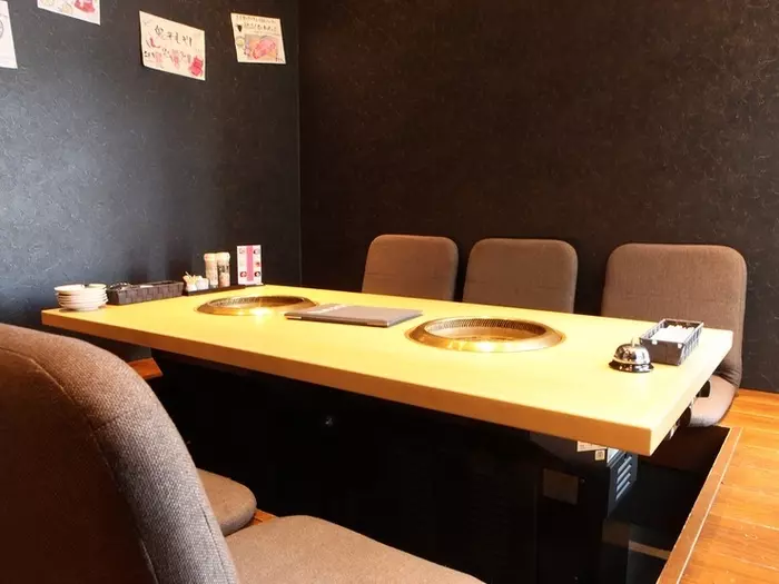 優しいライトが光る明るい店内は、ゆったりとした時間が流れます。テーブル席、カウンター席、2名席などがあり、デートから小さなお子様連れなど多様なシーンに対応します。テーブルごとにスタッフが焼き方を教えてくれるので、高品質な肉を最高の状態で楽しむことができます。
