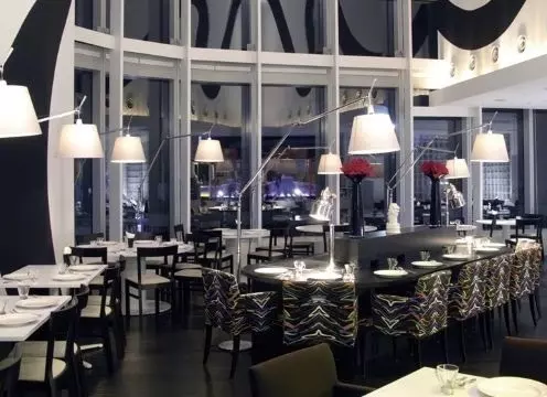 特徴的なエントランスを抜けて中に入ると、都会的で洗練された白が基調のインテリアが広がります。ランチタイムには大きな窓から明るい日差しが入り、銀座の街並みや東京タワーを眺めながら、優雅なひとときが過ごせます。平日は時間無制限でランチビュッフェをおこなっています。
