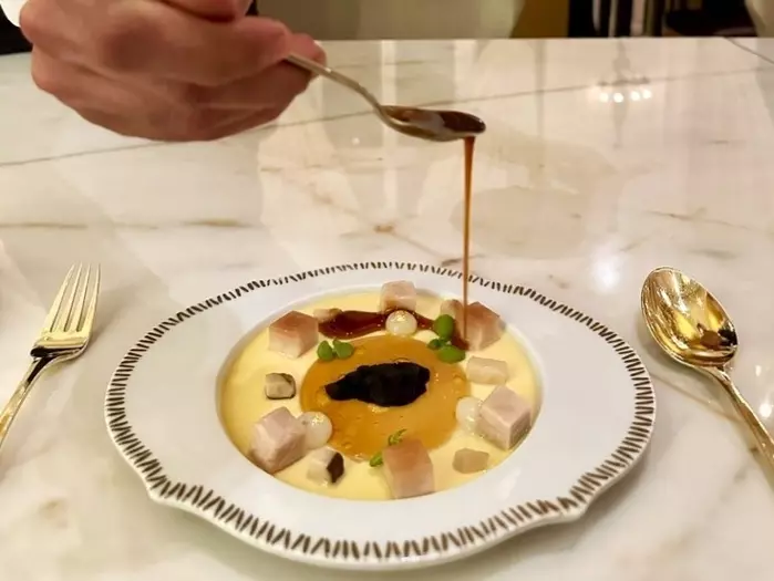 最初に出てきたのは、コックル(二枚貝)添のジルダと題されたもの。ジルダとは、バスク地方発祥のピンチョス(串刺しの軽食)のことで、青唐辛子、オリーブ、アンチョビに加えて小さな貝が一緒にささっているのが一般的なもの。それが海の香りの強いスープとして出されます。