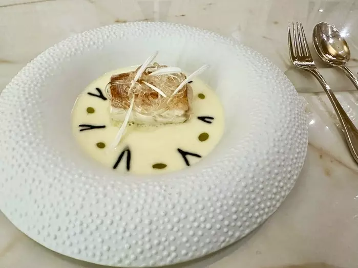メインの一つでしょうか。白トリュフの香りをまとった舌平目です。熟成酒が使われたソースは優しく香り高く、深みのある一皿です。