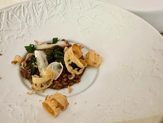 そして赤タコのリゾット。ダコスタ氏は米(アロス)料理の名人と言われた人で、これも彼の真骨頂の一つでしょう。出汁に干しダコの戻し汁が使われていますが、これはパエリアではなく、アロス・メロッソ(少し汁気のあるもの)で提供されます。海の記憶と発酵の香りにつつまれる深い味わいです。