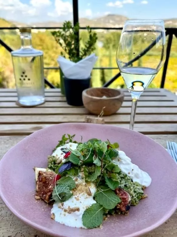 地元産のスパークリングワイン「ムルガネイラ(Murganheira)」で喉を潤し、キヌアのサラダをいただきます。新鮮なブッラータやローストした無花果が入っています。基本的に食材は半径50キロ以内で調達しているそうで、ワインもほぼこのエリアのものを提供しているそうです。