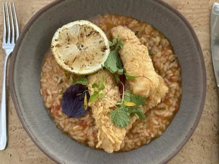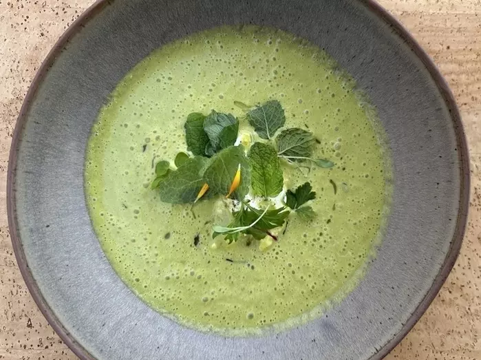 ランチに地元のビールを飲みながらアスパラガスのスープをいただきます。これがまた体に染み入るおいしさ。そして、この川で捕れたヨーロッパオオカワカマス(ノーザンパイク)のフリットをいただきます。あっさりした白身魚で塩とハーブのシンプルな味付けが爽やかな一皿です。
