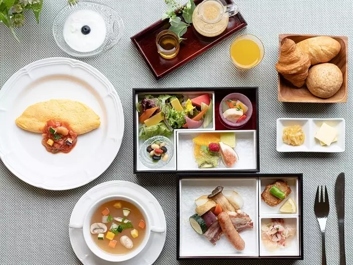 朝食は、和食と洋食をセレクトできるスタイル。和食では、優美な寄木細工の二段重に彩り豊かに盛り込まれた数々と共に、小田原産のお米「はるみ」が供されます。