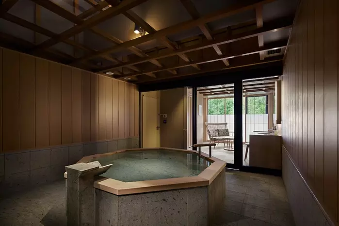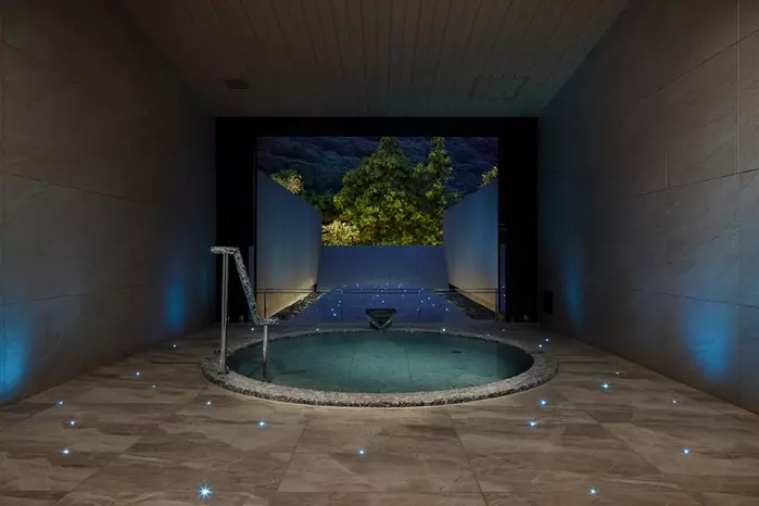 他3つの貸切風呂は、温泉棟に位置しています。八角型の「静寂の湯」は、上階まで吹き抜けの高い天井と、美しく格子状に組まれた梁が特徴。「水面の湯」は、浴槽からまるで窓の外へと繋がっているようなデザインが印象的。