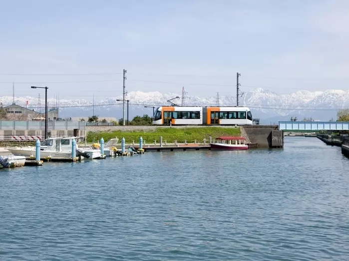 新湊の水辺を走る富山地方鉄道。海と山がすぐそばに寄り添う、富山らしい原風景