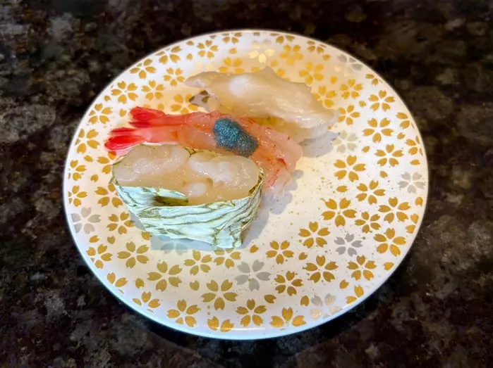 続く「地物三種」は、コリッとした歯ざわりが心地よいバイ貝、鮮度のよさが際立つ甘えびの卵のせ、昆布で巻いた“富山らしい”白エビの軍艦。噛むほどに昆布の旨みと白エビの甘さが重なり、思わず唸る味わいで、いずれも氷見の朝獲れならではの生命力と、富山の海がもつ豊かな表情をダイレクトに感じさせてくれました。