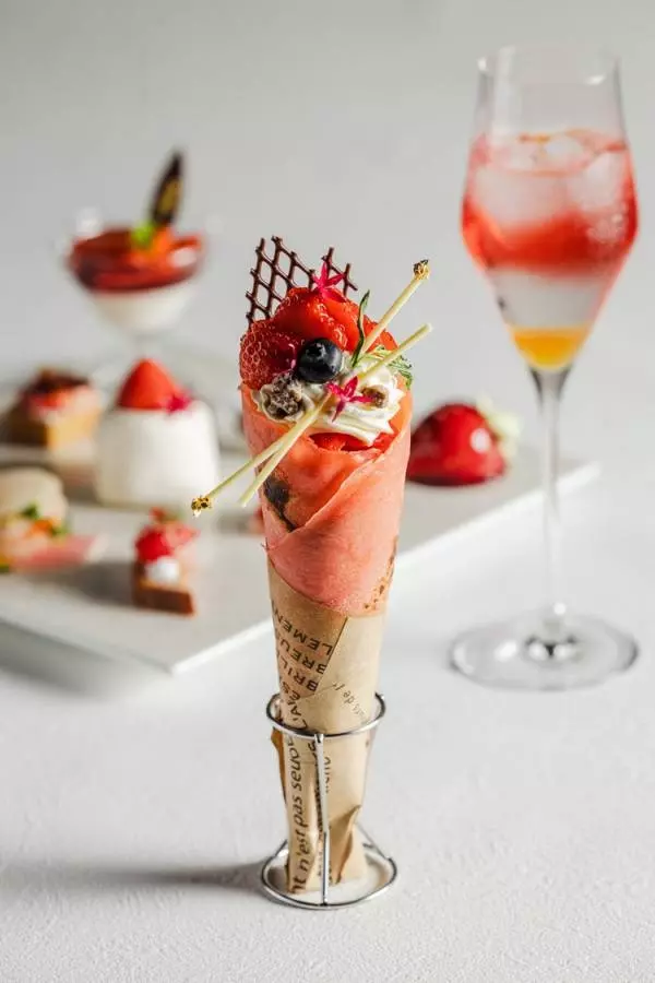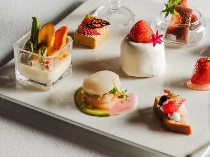 ホテルの特性も活かし「水ようかん」など“和”のテイストも取り入れたスイーツは、どれも可愛らしいいちごが主役となった、見ているだけでも顔がほころぶものばかりです。
