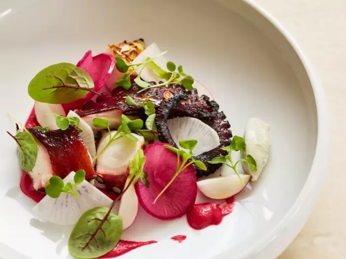 料理の一例『炭焼きタコのコンフィ ラディッシュのピクルスとゴルゴンゾーラ風味の麹チーズを添えて』2,500 円
