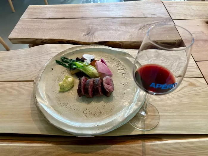 合わせた赤ワイン『ソーシャル・クラブ』は、黒果実とスパイスの豊かな香りが広がり、力強さの中に柔らかさを感じる一本。最後に残るほのかな苦味が鹿肉のコクと見事に調和していました。
