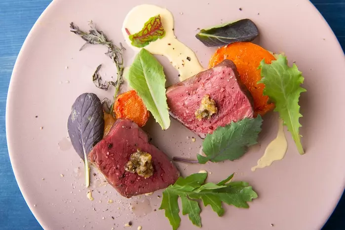 徳島と長野の食材で彩るフランス料理に日本酒を合わせる【MAEN Sake pairing restaurant】。料理と日本酒のペアリングを追究し、熱燗を一皿のアクセントとして取り入れます。約80種が集う日本酒は銘酒揃いで、温度帯や酒器をかえて変幻自在なペアリングを披露。温度や酒器を工夫し、燗酒が持つふくらみを料理と重ねることで、新しい味わいを提案しています。