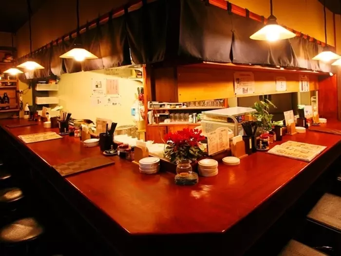 店内は、傘型のペンダント照明や赤茶色の木製カウンター、藍色の暖簾など、昭和レトロなムードに包まれています。座席は厨房をぐるっと取り囲んだカウンター席15席のみで、初めて訪れてもすぐに馴染んでしまうような家庭的な雰囲気が魅力。おふくろの味を求めて、近隣に住む老若男女の単身者が数多く訪れるというのも納得です。