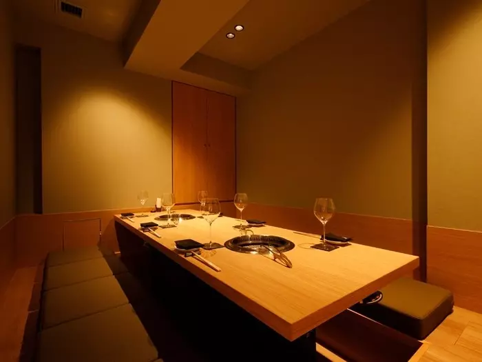 北新地より徒歩2分の全室が完全個室の焼肉店。街の喧騒を忘れるような落ち着いた店内には、大小異なる7つの個室があり2名から最大18名まで利用できます。すべての部屋に強力な無煙ロースターと換気設備が完備されており、3分ごとに部屋の空気が入れ換わるのでにおいを気にせずに食事を楽しめます。