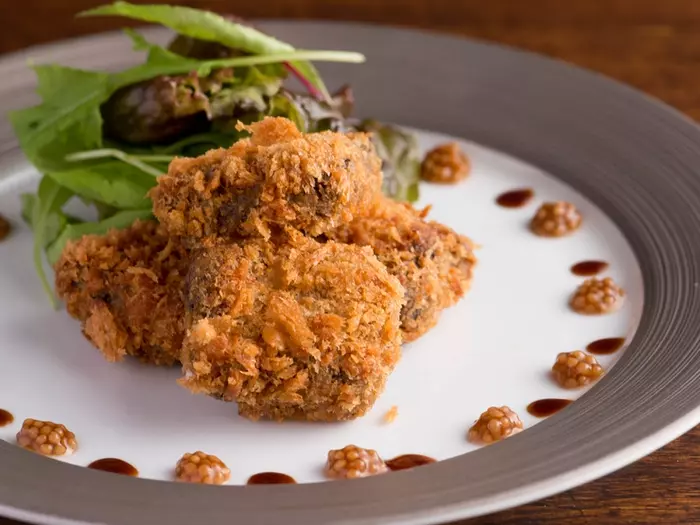 和牛のホホ肉を圧力鍋で柔らかく仕上げ、ホクホクでトロトロな食感が魅力的な『和牛のホホカツ』