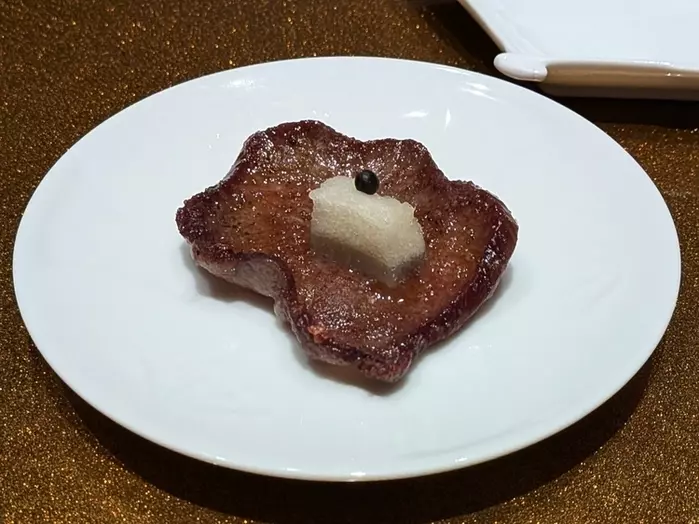 『厳選脱水タン~たてみち檸檬の泡檸檬~』は最初に上に乗っている粒胡椒を口にし、風味が広がったところで“泡檸檬”を溶かしてタンとともにいただく、味わいの幅や変化にもワクワクする一品
