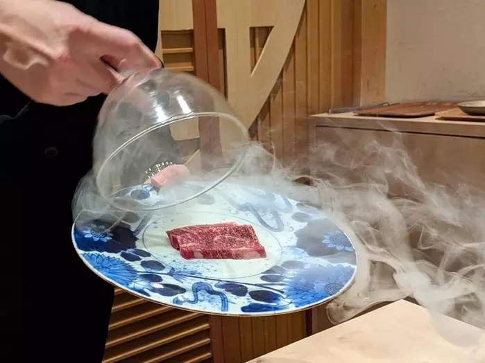 二段階に分けて燻製を施しているという『厳選黒毛和牛燻製ハラミ~粒マスタード~』。目の前で薫香が広がる瞬間が楽しめます