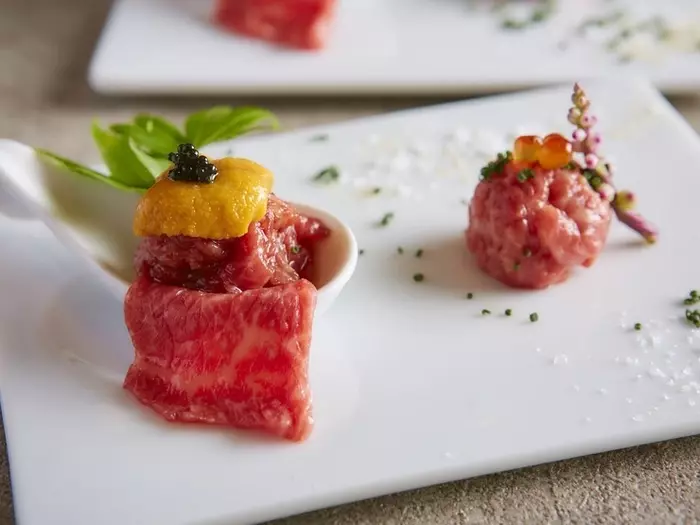 日本一を誇る和牛へのこだわりを持ち、厳選された3種類の赤身和牛を軸にフレンチやイタリアンの要素を取り入れた新感覚の料理法で提供。アラカルトもありますが、定番から特撰まで多彩なコースが揃っています。ワインのラインナップにもこだわり、ソムリエがセレクトした銘柄も楽しめます。