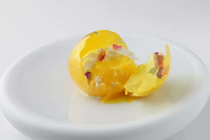 コース料理のラストを飾るデザートは、飴細工の球体を割るとみかんとヨーグルトのクリームが現れる『愛媛県産柑橘のスフェール』など、見た目にも驚きのある一皿。季節ごとに変わる多彩なデザートと小菓子の趣向に、会話も弾むことでしょう。