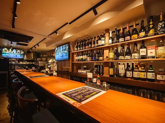 木の温もりを感じる落ち着いた店内には、ハイテーブル席とカウンター席を完備。居心地のよい空間です。ドリンク類も豊富でワインはリーズナブルな価格から約30種類取り揃えられ、グラスワインも豊富。テレビモニターが4台設置されているので、スポーツ観戦をしながら食事やお酒が楽しめるのも魅力です。