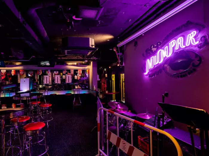 色鮮やかな電飾に彩られた店内は、ダイニングバーとしての顔を持ち、週末には生ライブのミュージックバーとしても楽しめます。