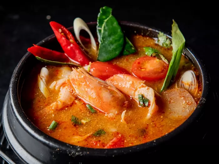 唐辛子の辛さの中にある、爽やかな酸味やパクチーの香りが印象に残る『トムヤムクン』。海老の殻、魚介、野菜から出る濃厚な旨みも堪能