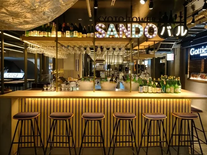 【KYOTO TOWER SANDO バル】は珍しいお酒から人気の銘柄までさまざまな種類のお酒が楽しめます。中でも京都の地酒やクラフトビールはイチオシ。京都城州白梅を使ったスパークリングワインなど、京都産の贅沢なワインが堪能できる『丹波ワイン』もオススメです。お酒好きには、日本酒とビールの利き酒セットもぜひ。