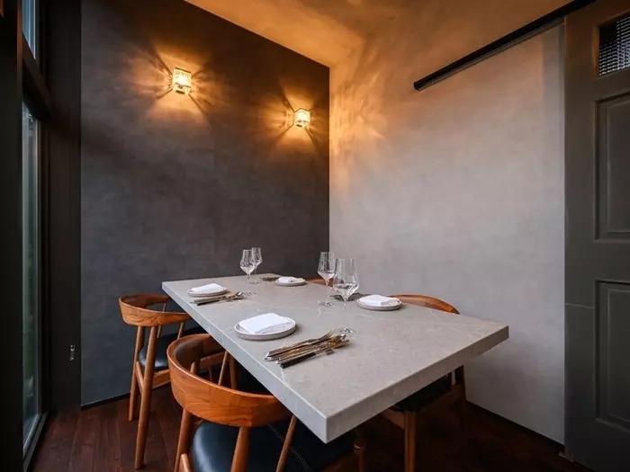 2面に大きな窓が広がるメインダイニングは、開放感あふれる伸びやかな空間。壁やテーブルはグレー、床や椅子はダークブラウンでコーディネートされ、落ち着きのある雰囲気を醸し出しています。完全個室も上質な色合いで統一されていて、大人デートや大切な記念日のお祝いなどにぴったり。平日23時まで営業しているのも、うれしいポイントです。