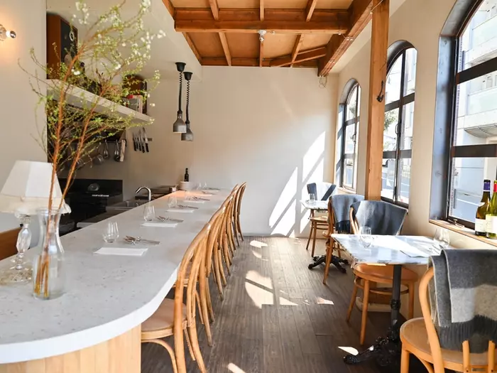 古民家をリノベーションした店舗は、フランス語で「居心地のいい」などを意味する店名どおりの空間。白を基調とした内装に、温かみのある木目がアクセントになり、リラックスできる雰囲気に包まれています。ゆったりとしたカウンター席に加え、プライベート感のあるテーブル席も用意。気軽に本格的な味が楽しめる、とっておきの一軒です。