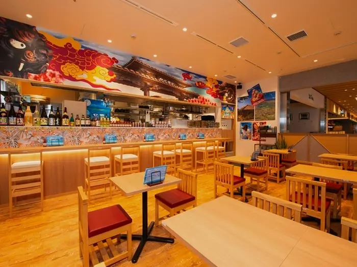 店内には沖縄の風景や意匠が描かれていて、まるで現地を訪れたような気分になれます。テーブル席のほかカウンター席もあり、一人でも気兼ねなく過ごせる居心地のいい雰囲気。仕事帰りにふらりと気軽に立ち寄れます。明るい南国ムードに包まれながら料理をつまみお酒を飲む、楽しいひとときが過ごせるお店です。