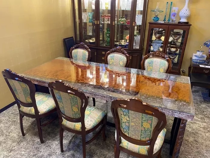 高級ヨーロピアン家具を配置した店内は、非日常感に包まれています。オススメはライブ感あふれるカウンター席。目の前でシェフが調理する様子が五感で楽しめます。テーブル席の自社作成天板は、まるで芸術品のよう。個室は周りに気兼ねせずに食事を楽しみたい人にぴったりです。テラス席もあり、愛犬と一緒に食事ができます。