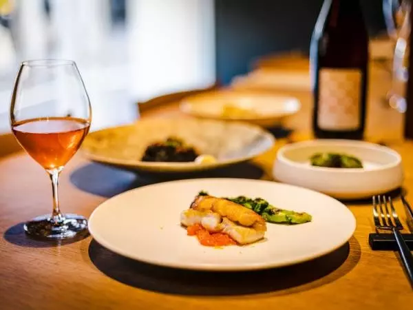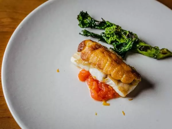 この日の魚料理は、ヒラメに飴色に火入れした玉ねぎ、アリオリソースを重ねたオーブン焼き。本場スペインではタラを使う伝統料理をベースにしているそうです。にんにくの効いたアリオリ、トマトのフレッシュなソースが親しみやすくも、ヒラメの繊細な味わいが生きています。