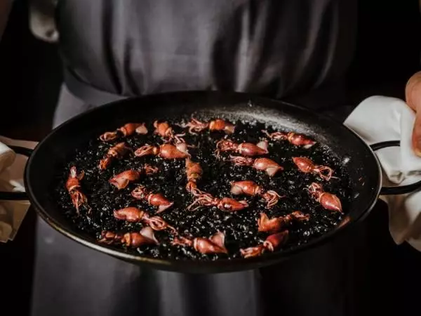 鍋ごとお目見えしたのは、ホタルイカを散りばめたイカ墨のパエリア。そこから一皿ごとに取り分け、木の芽をあしらい、アリオリソースを添えて供されます。刻んだホタルイカと葉にんにくを炊き込んであり、濃厚な旨みが口いっぱいに広がります。力強い味わいの中に、木の芽の香りが心地よいアクセント。